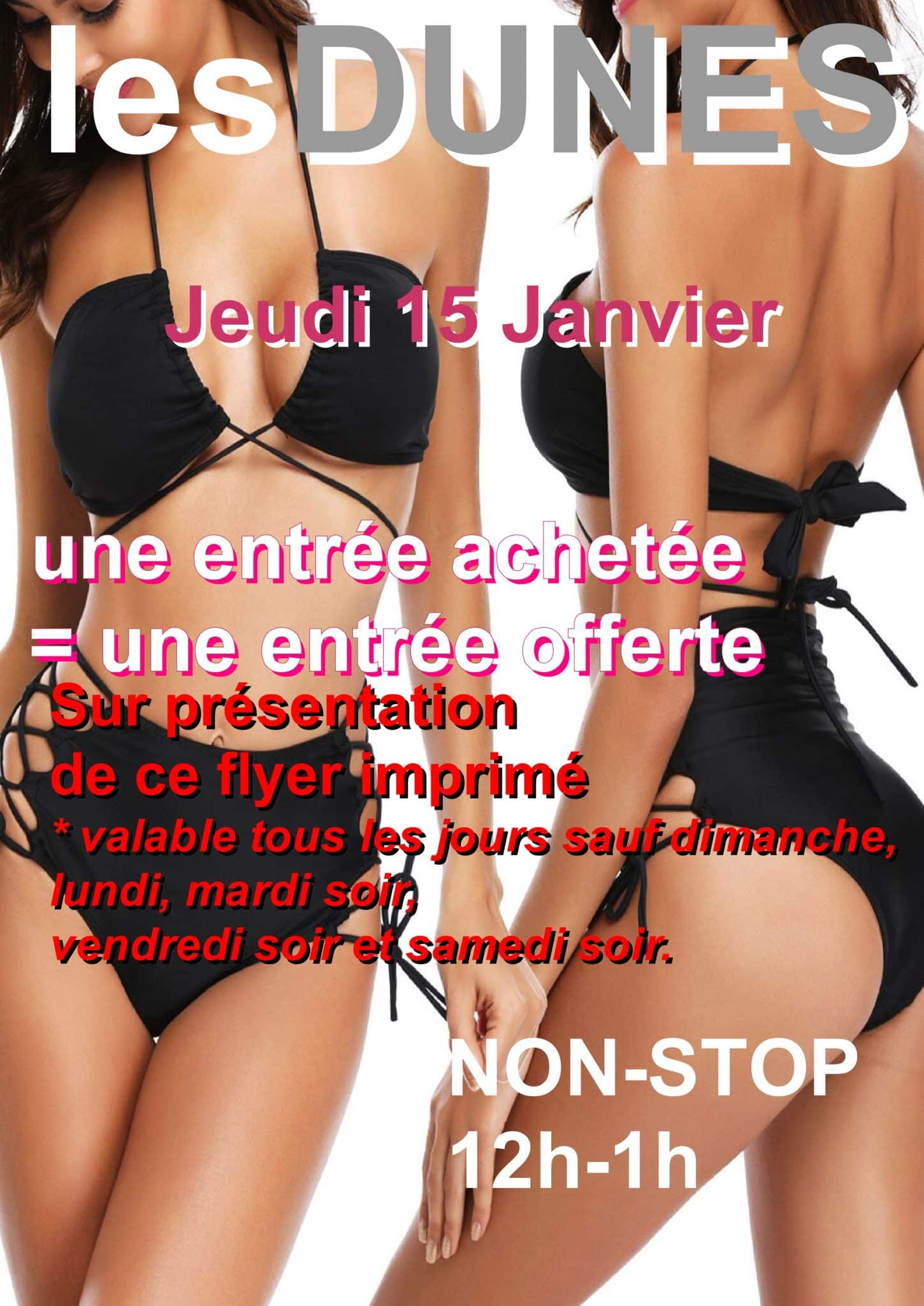Le club est ouvert en mixte et en non-stop de 12h à 1h. Entrée achetée=entrée offerte sur présentation du flyer imprimé
